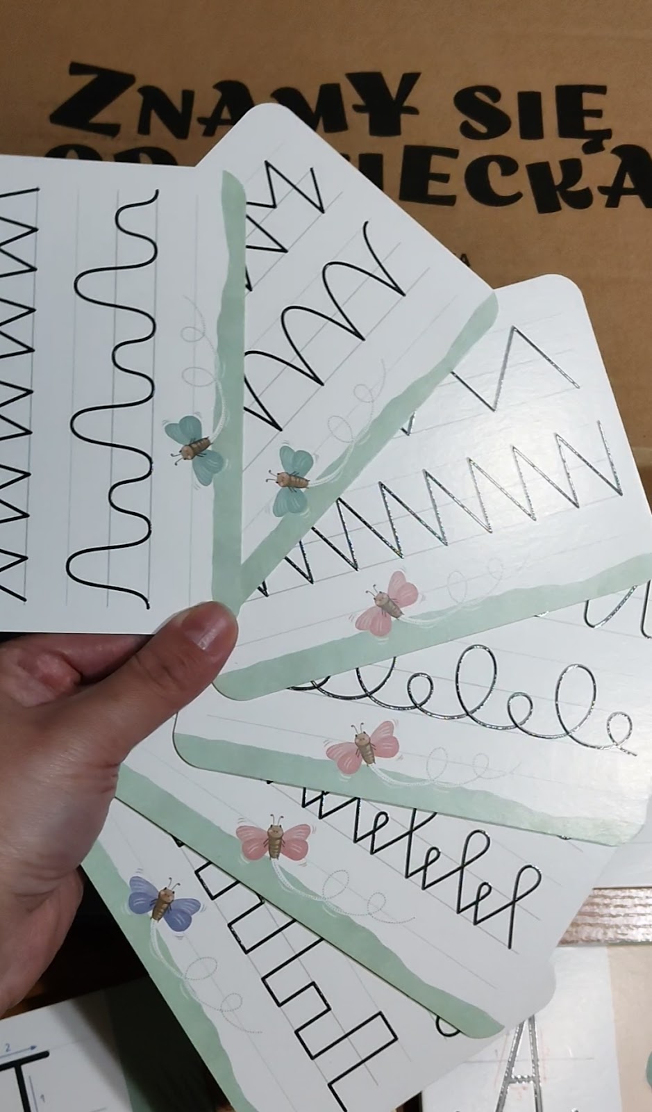 Ale odnośnie samych kart. Są duże i sztywne. Przejrzyste i dwustronne. Ilustracje stonowane a szlaczki ciekawe. Tu do gry wkracza nie tylko wzrok - również dotyk. Na każdej z kart znajdują się uwypuklenia literek, które dodatkowo pozwalają dziecku poznać je z bliższa.